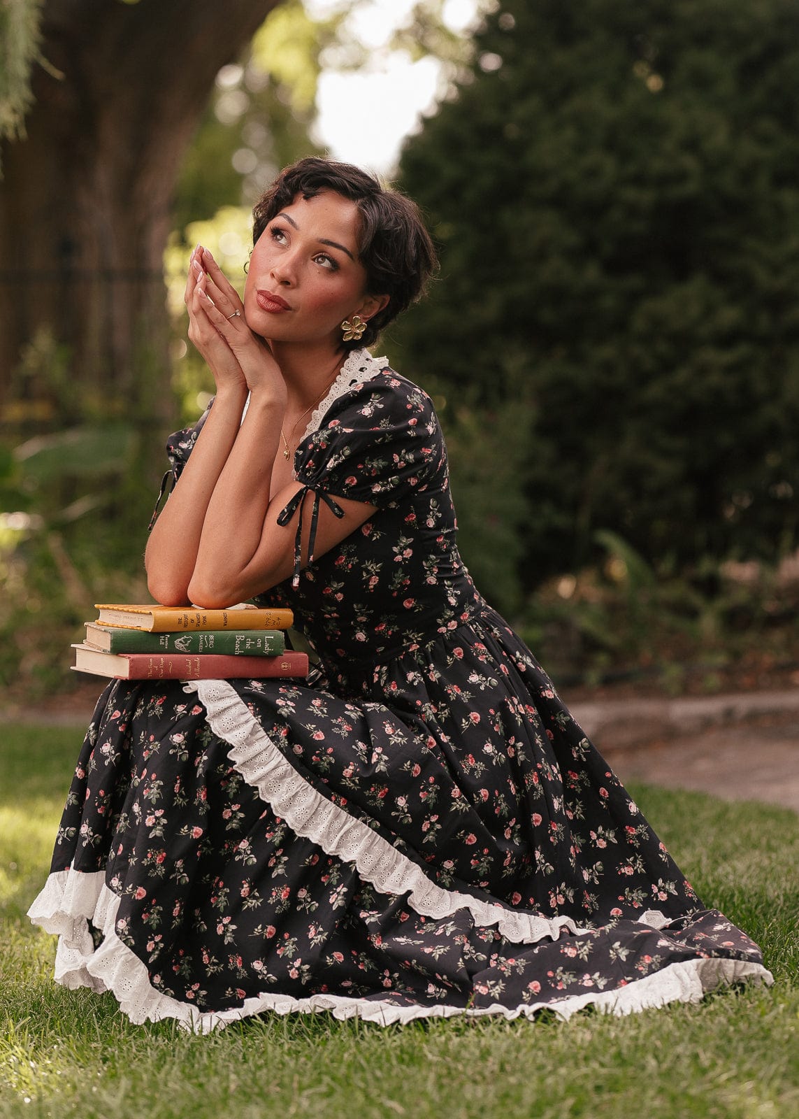 The Fawn Dress is a cottage-core dream with its vintage-inspired floral print and charming lace details. Featuring puff sleeves with dainty bows, a sweet square neckline, and tiers trimmed with eyelet lace, it’s both nostalgic and romantic. Its black base with delicate blossoms makes it versatile for every season while still feeling whimsical and feminine. A timeless piece that feels straight out of a storybook.