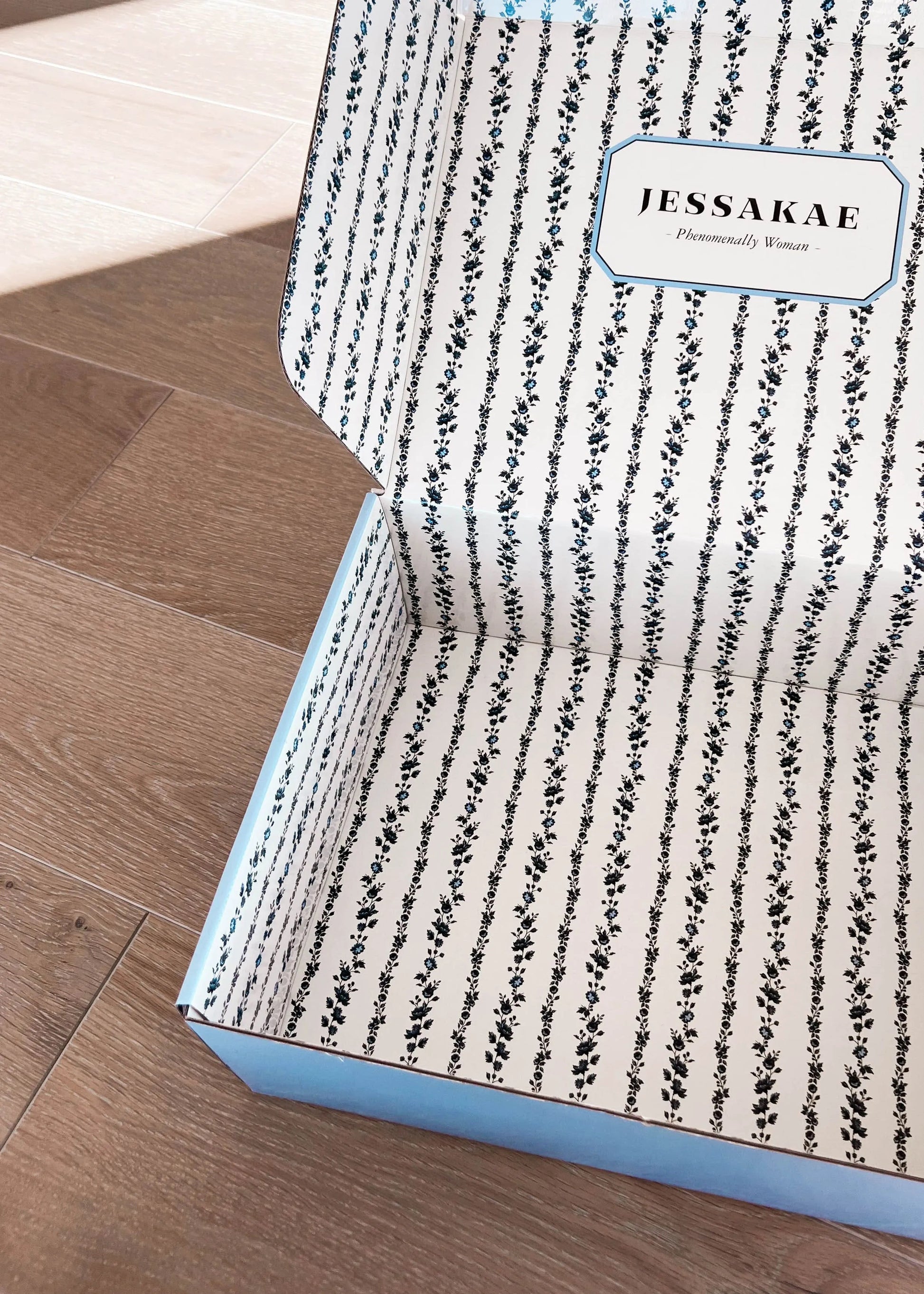 Ship your order in style, either to yourself or a special recipient! When adding a Gift Box to your order, you can expect it to be delivered in our specialty JessaKae box, with items wrapped in custom tissue paper, and sealed with a sticker.