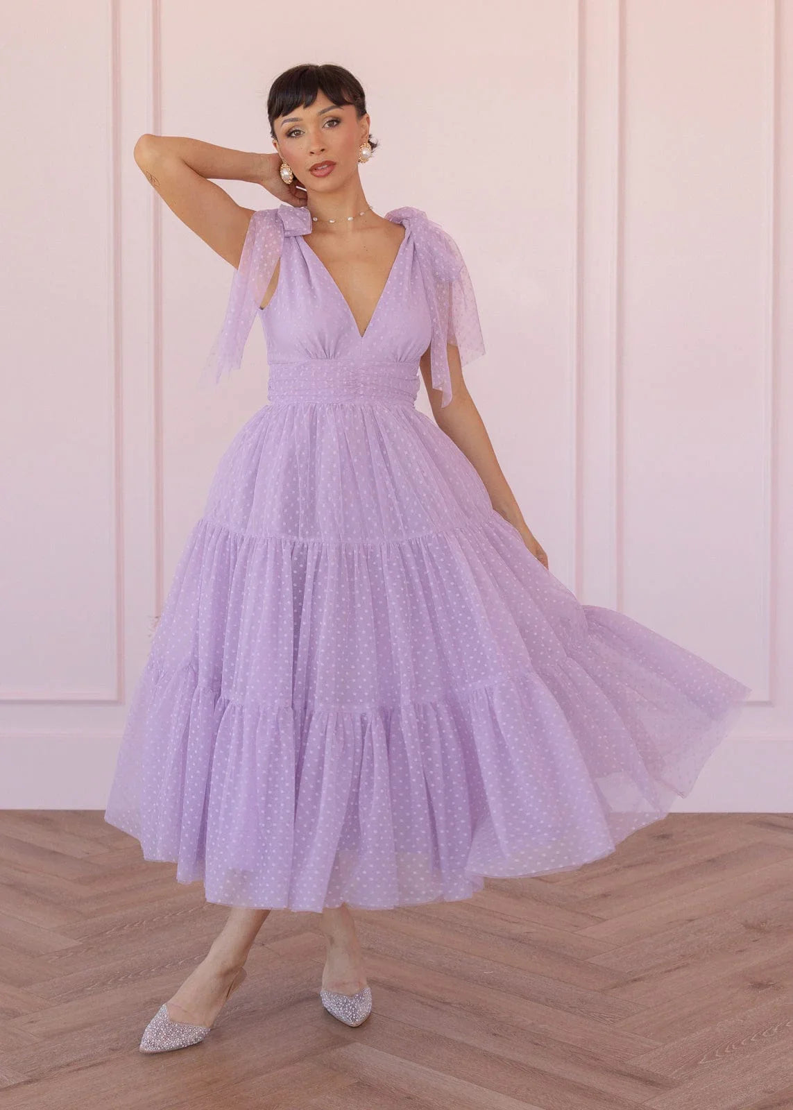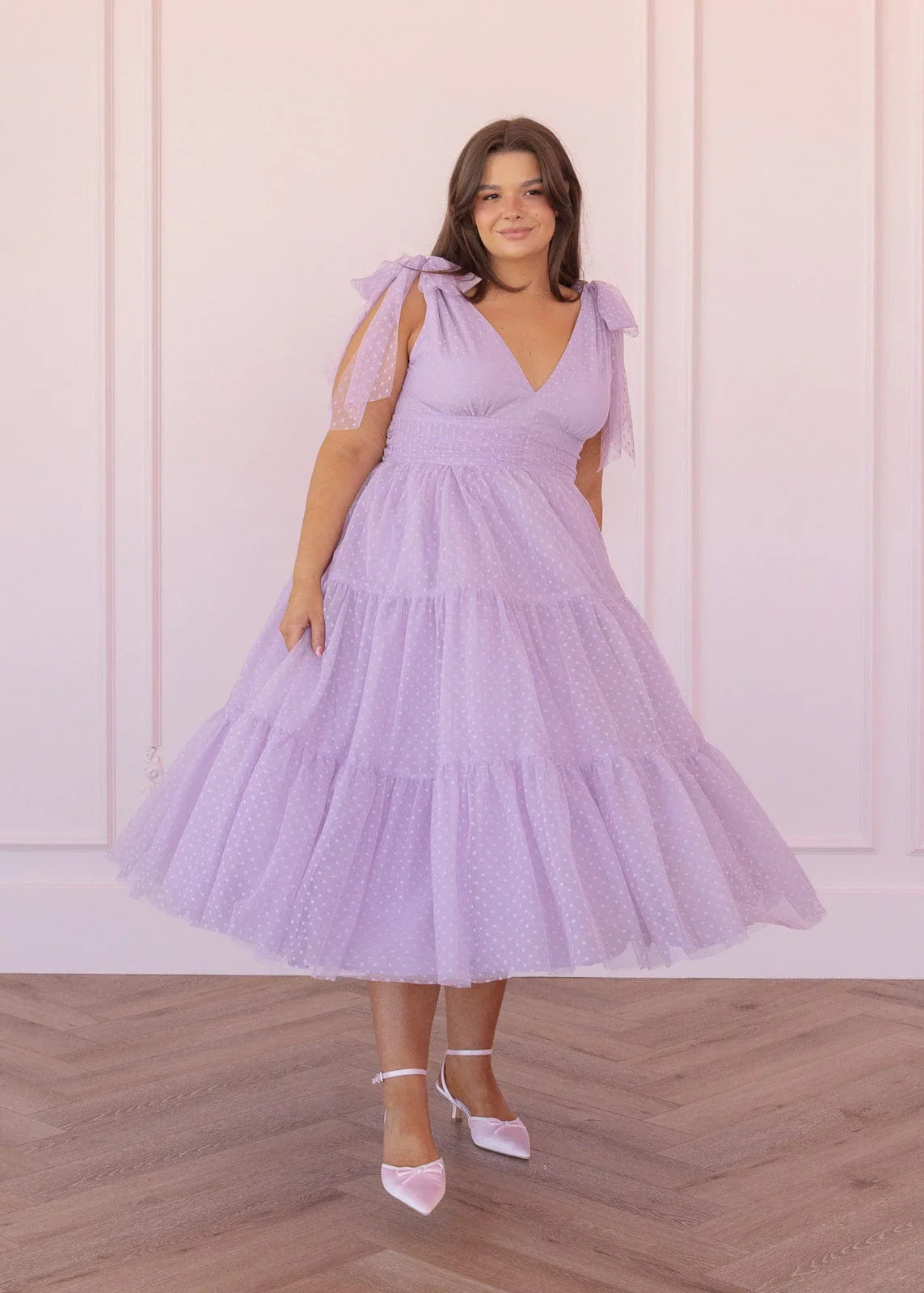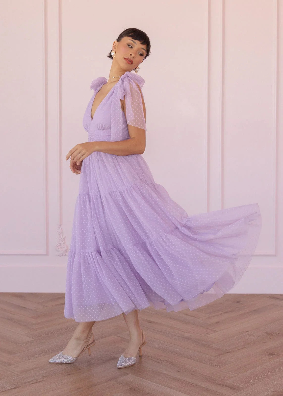 The Jeanne Dress is the definition of whimsical charm, featuring soft dotted tulle and an effortlessly romantic tiered skirt. Its delicate shoulder bows and flattering ruched waistband bring a fairytale feel to every step. The dreamy lavender hue makes it perfect for spring soirées, bridal events, or simply twirling through a sunlit afternoon. With a silhouette that flatters and details that enchant, Jeanne is made for your most magical moments.