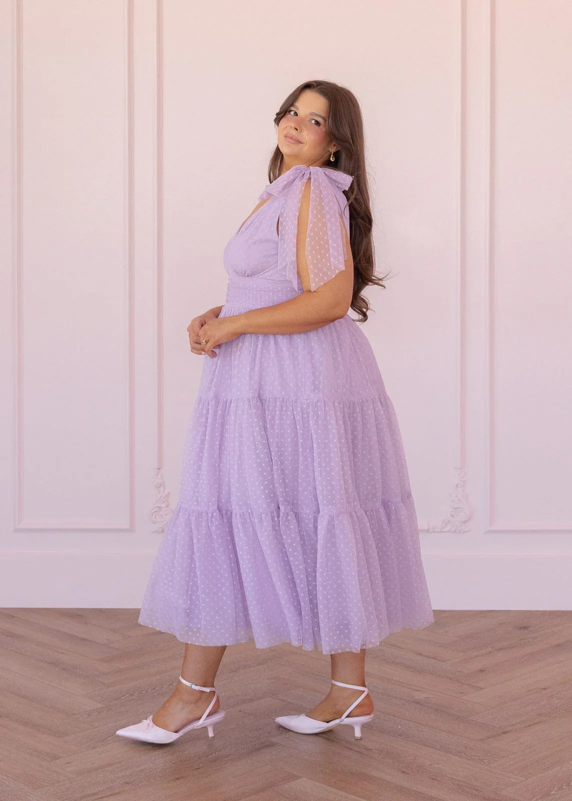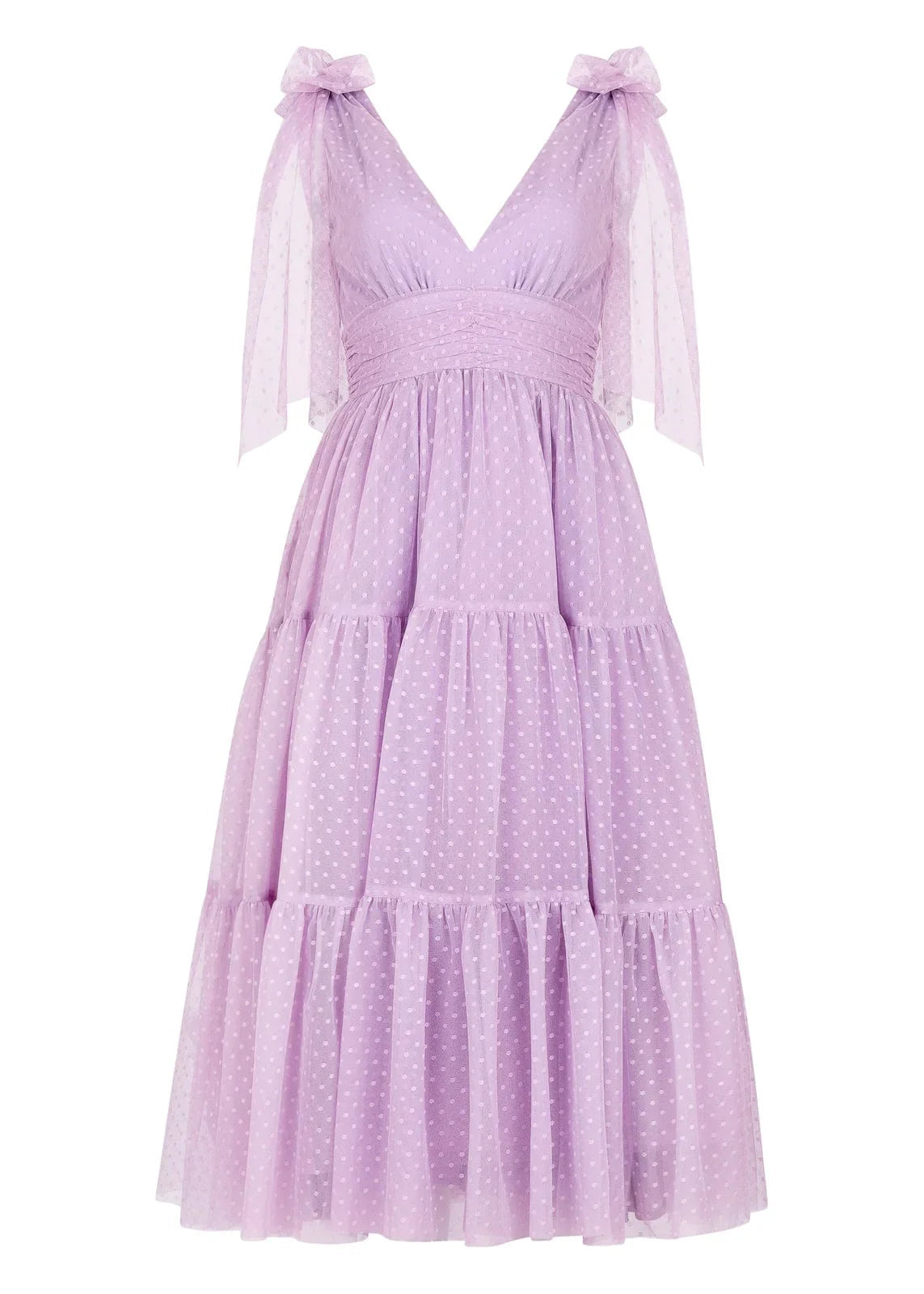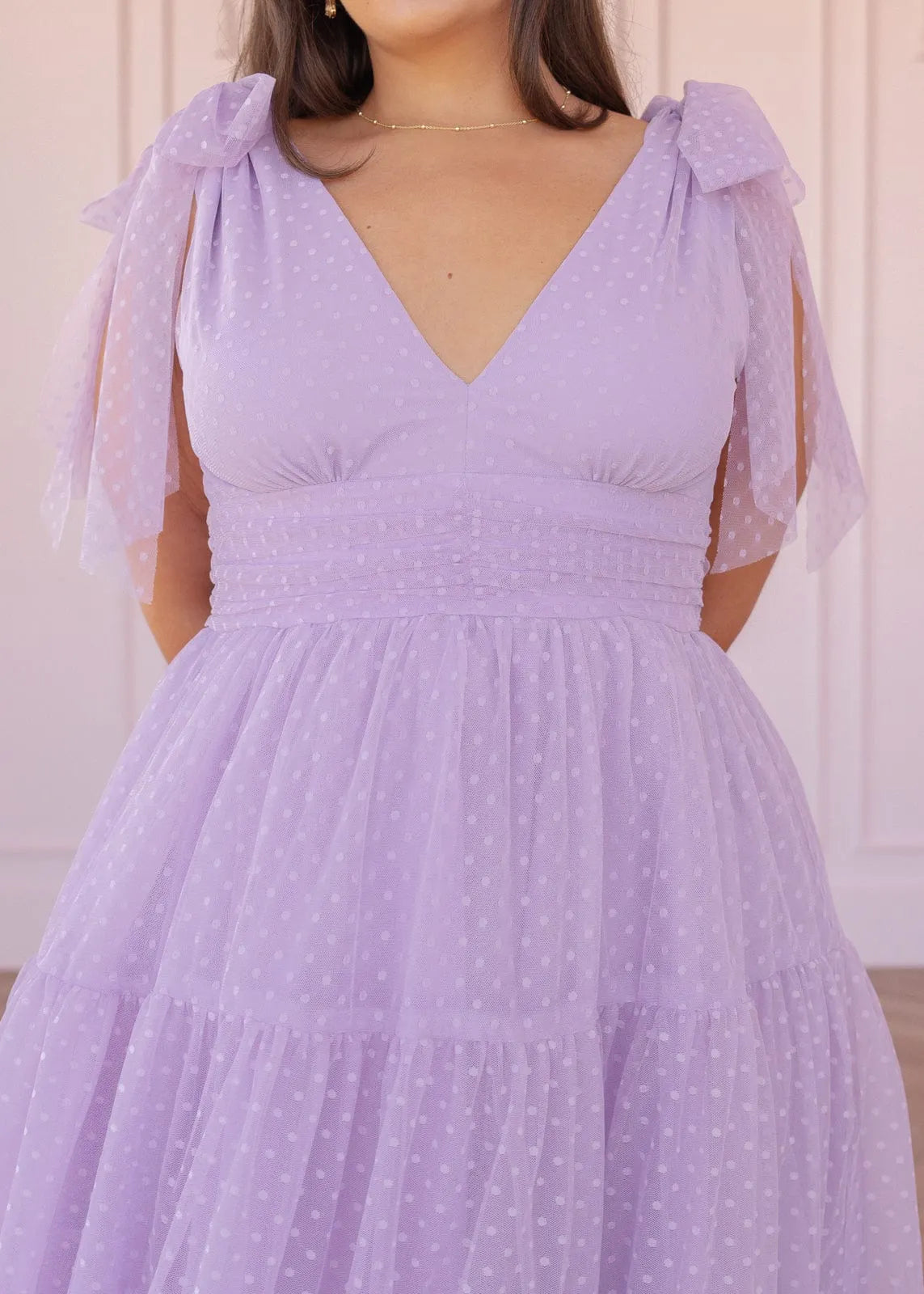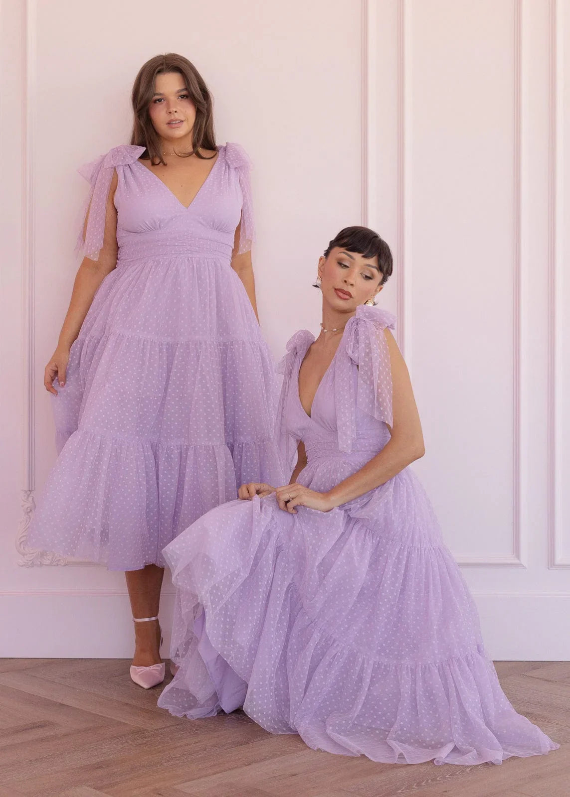 The Jeanne Dress is the definition of whimsical charm, featuring soft dotted tulle and an effortlessly romantic tiered skirt. Its delicate shoulder bows and flattering ruched waistband bring a fairytale feel to every step. The dreamy lavender hue makes it perfect for spring soirées, bridal events, or simply twirling through a sunlit afternoon. With a silhouette that flatters and details that enchant, Jeanne is made for your most magical moments.