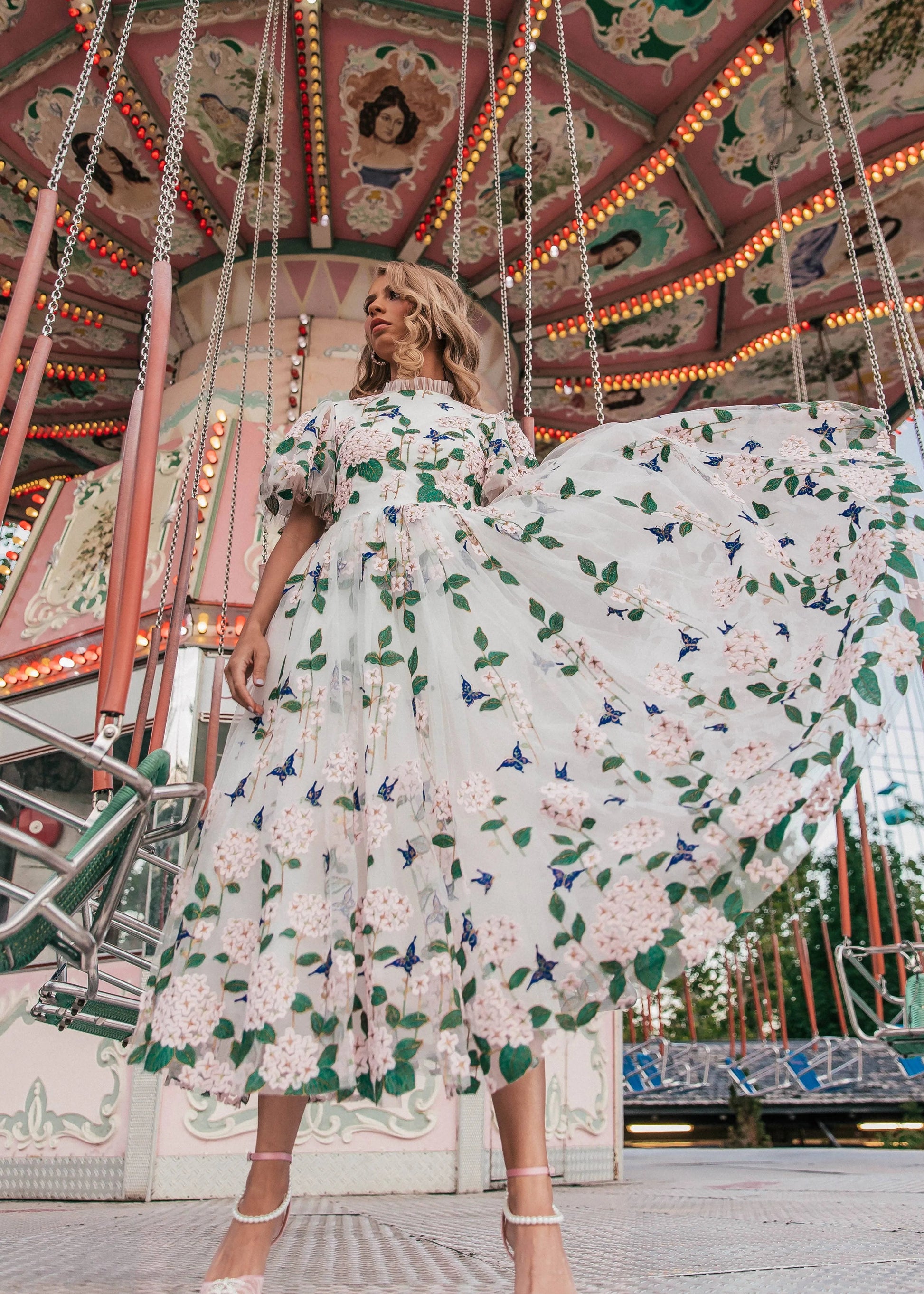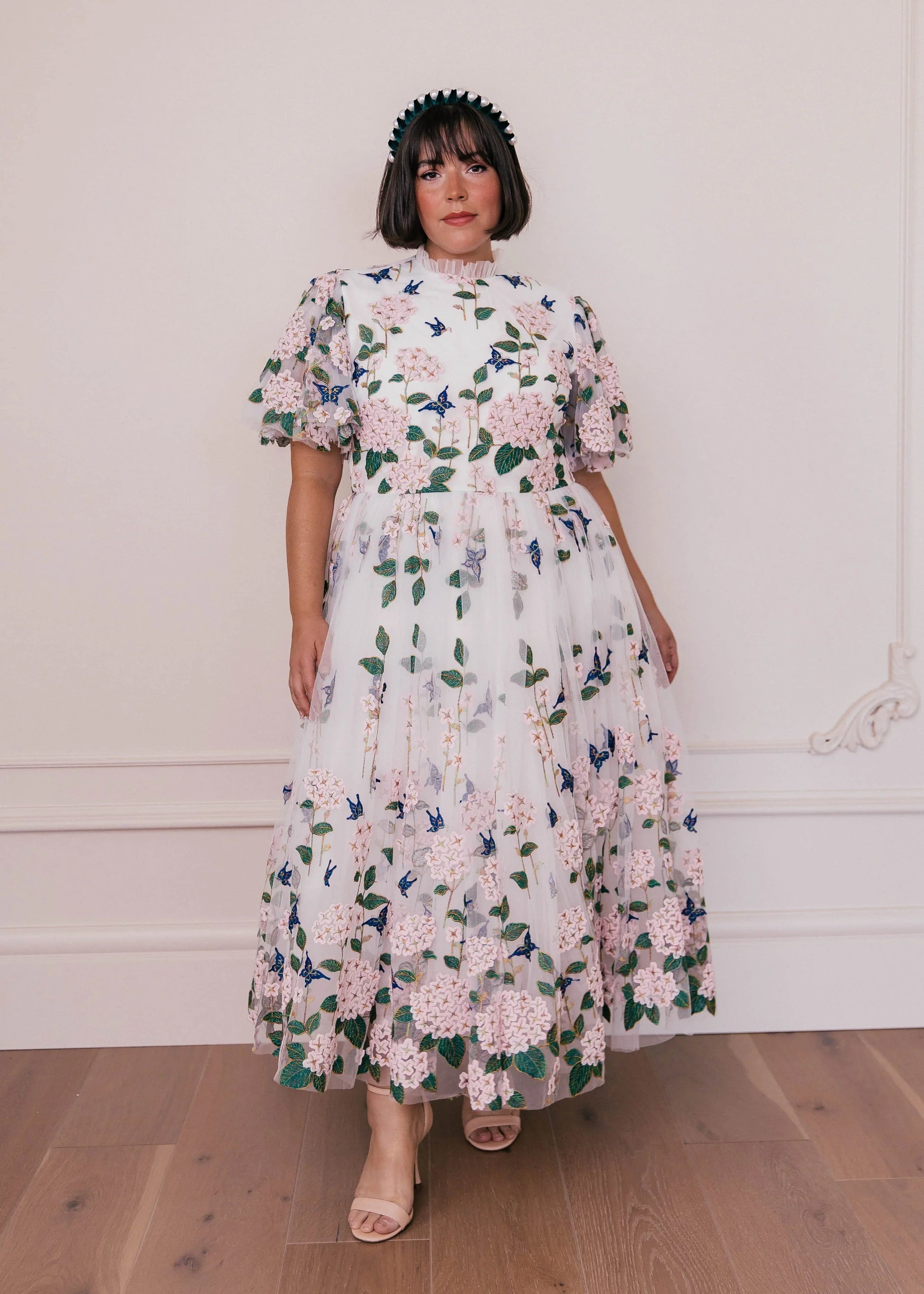 This beautiful and delicate floral embroidery dress is a statement piece for any occasion. The sheer flutter sleeves and fitted waistline create a feminine silhouette, while the ruffles along the neckline are fun and flirty. Hidden back zipper for on-and-off ease.