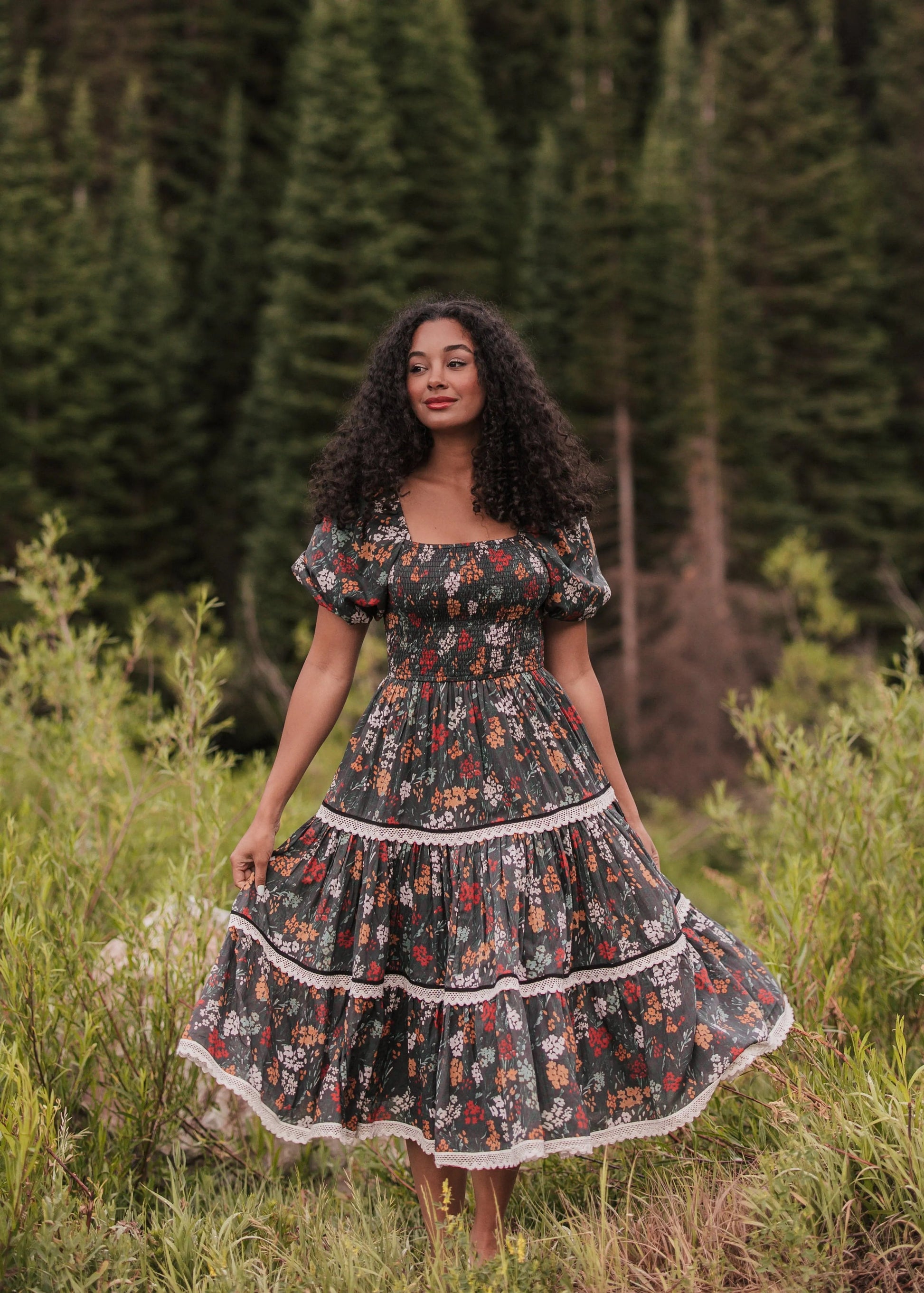 This playful, charming dress features a smocked bodice that comfortably contours to your shape, creating a flattering silhouette. The dress displays a dark floral print reminiscent of a blooming midnight garden or a moonlit field of flowers. The tiered skirt is adorned with delicate lace trim, adding a touch of vintage charm and feminine elegance. Perfect for an autumn stroll of cozy evening gathering, the Midnight Garden Dress will be your go-to dress for daily comfort, flexibility, and style.