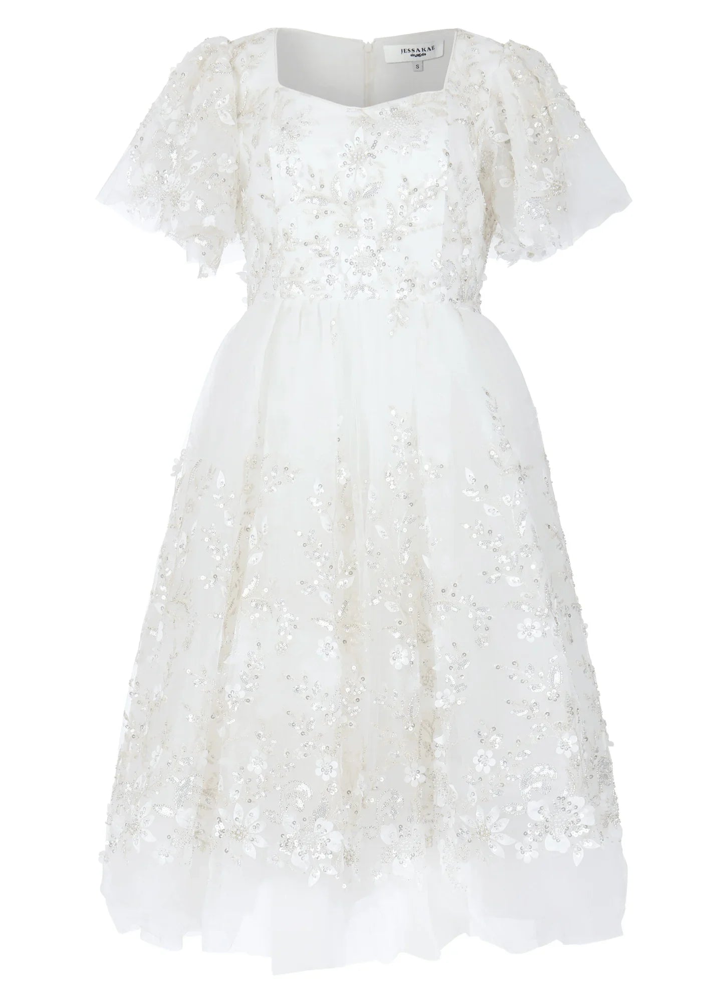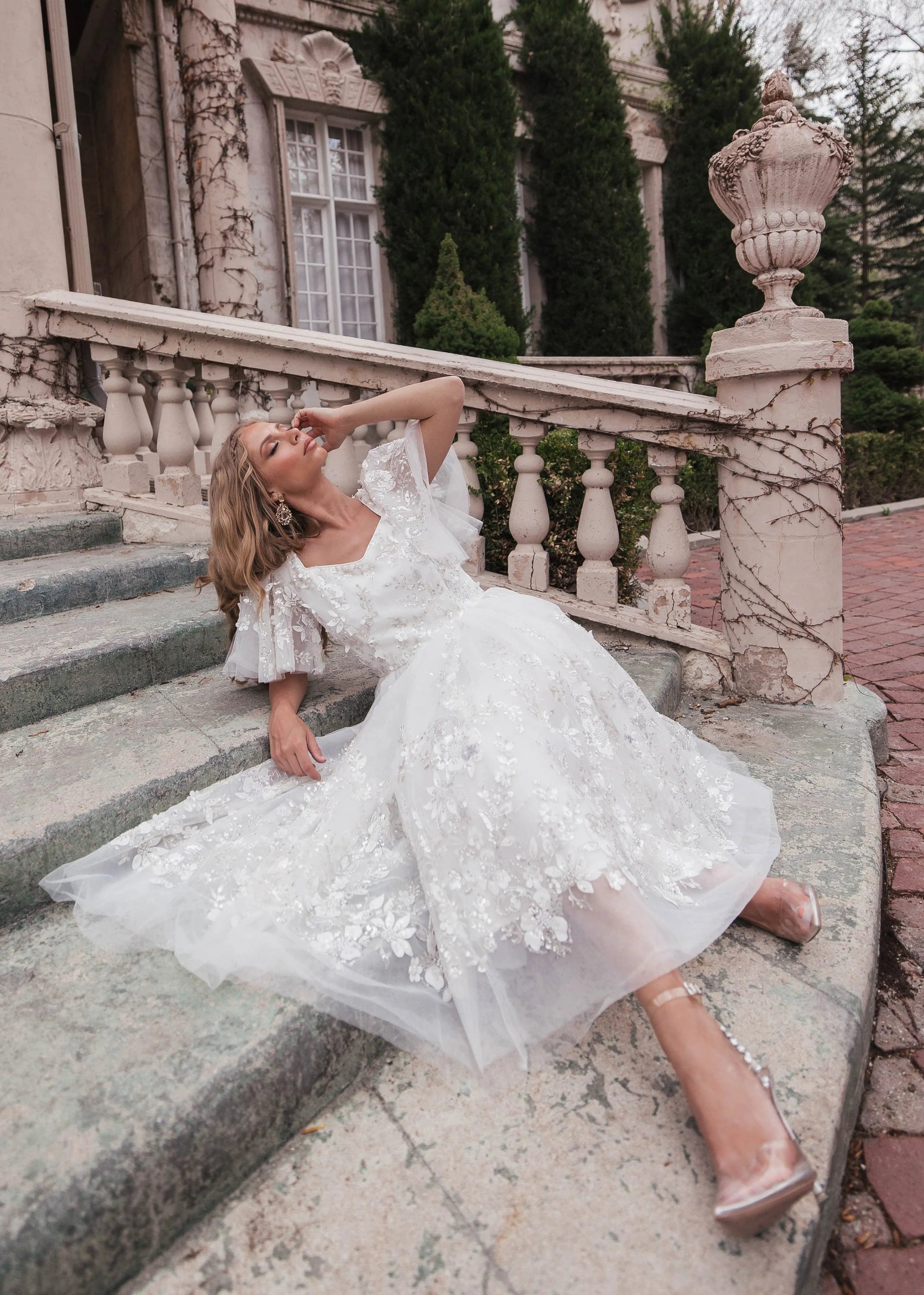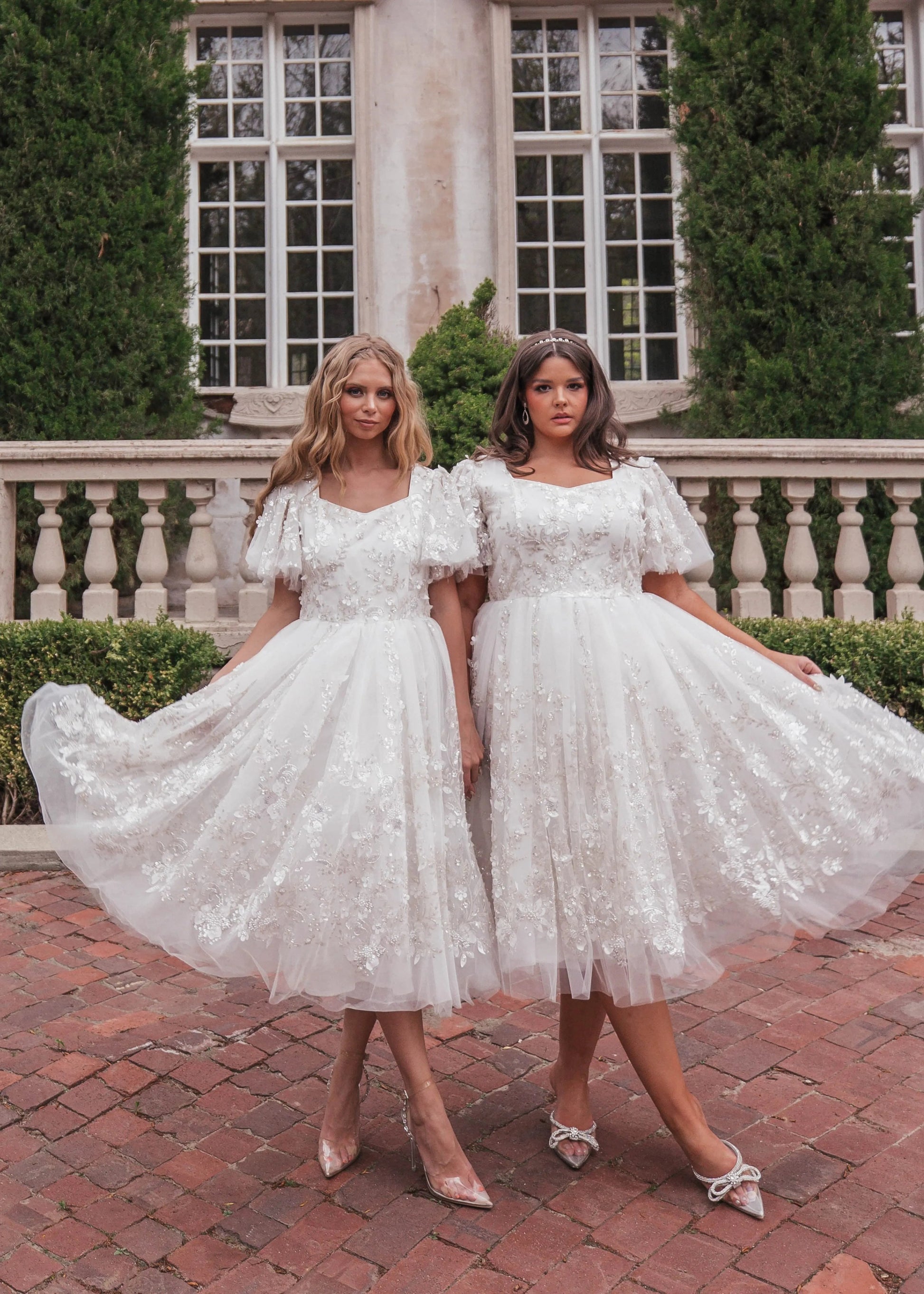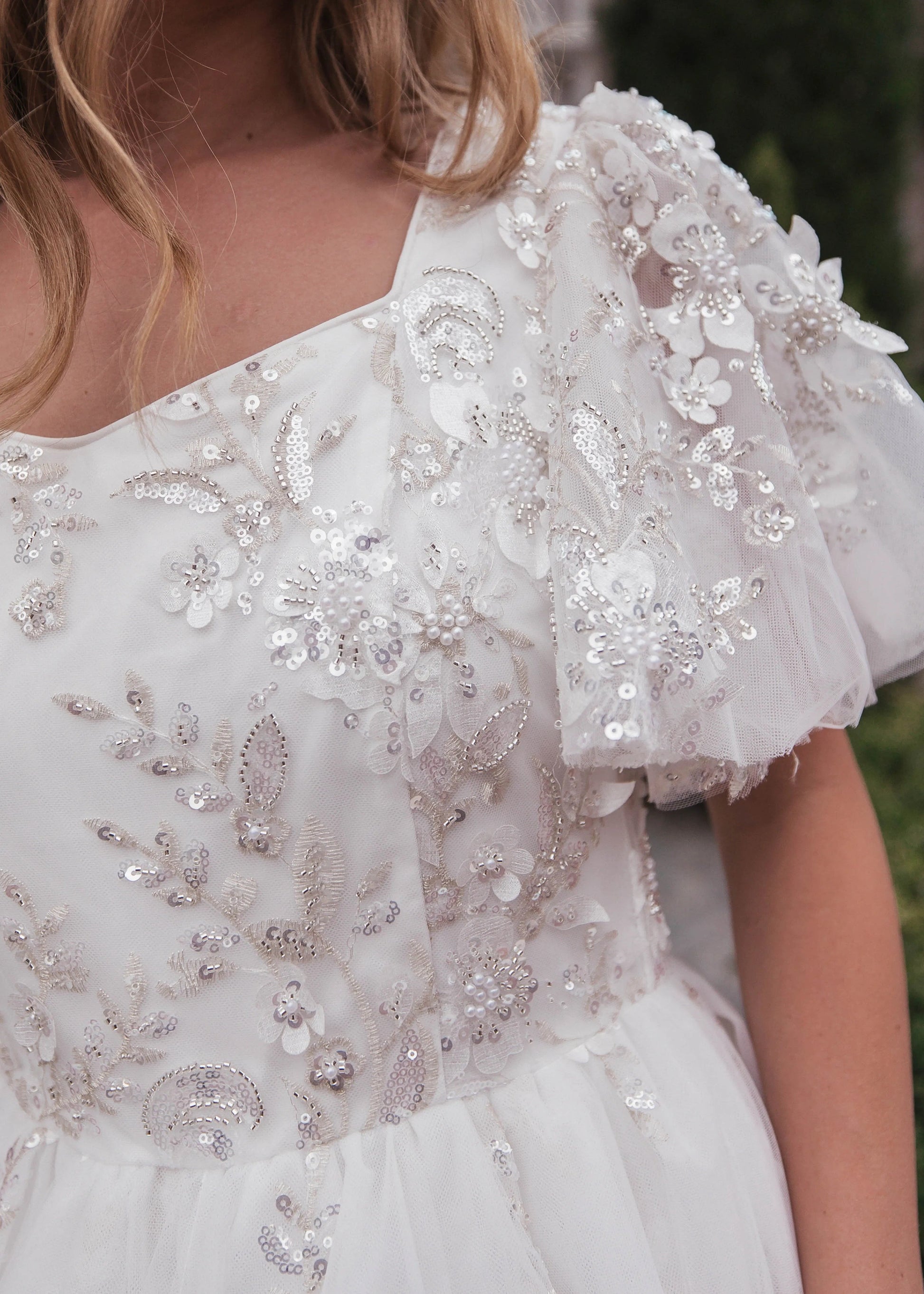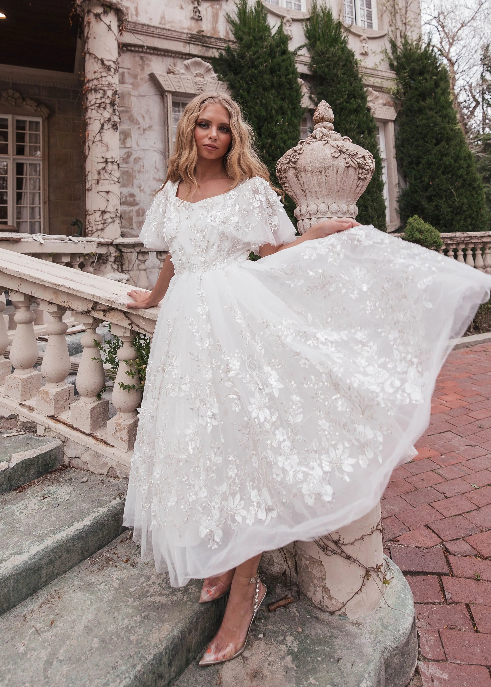 Designed for the modern-day queen, this dress features a flattering silhouette, a graceful A-line cut, and delicate floral appliqués. Perfect for formal events, rehearsal dinners, or even a romantic evening out, this dress adapts to your every whim.