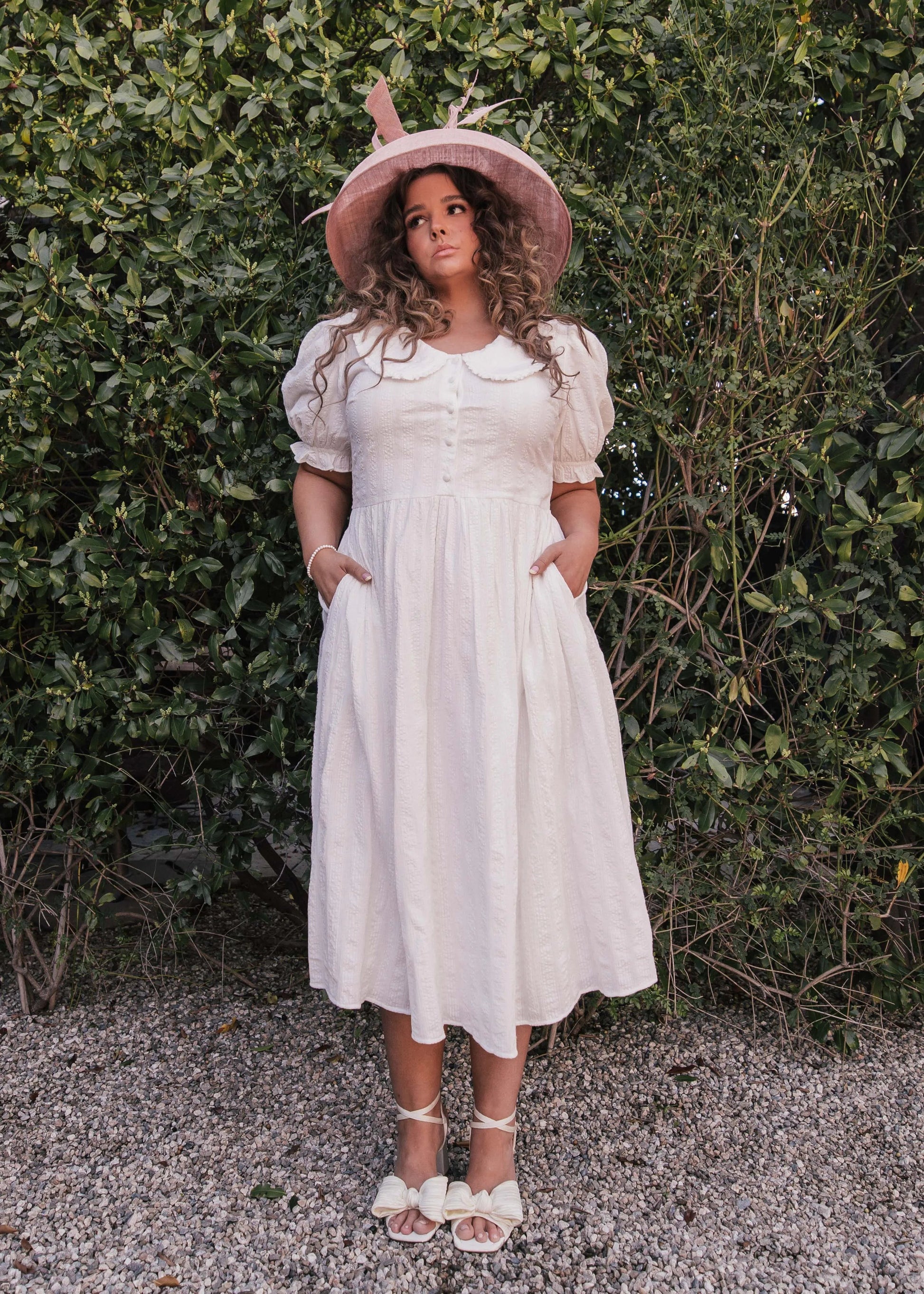 This simple and classic dress is perfect for all your upcoming spring and summer adventures. It features pockets, a detailed oversized collar, and functional buttons. The smocked back and elastic puff sleeves provide a comfortable and flattering fit for all body types. Perfect for a casual weekend brunch with the girls. Fully lined.