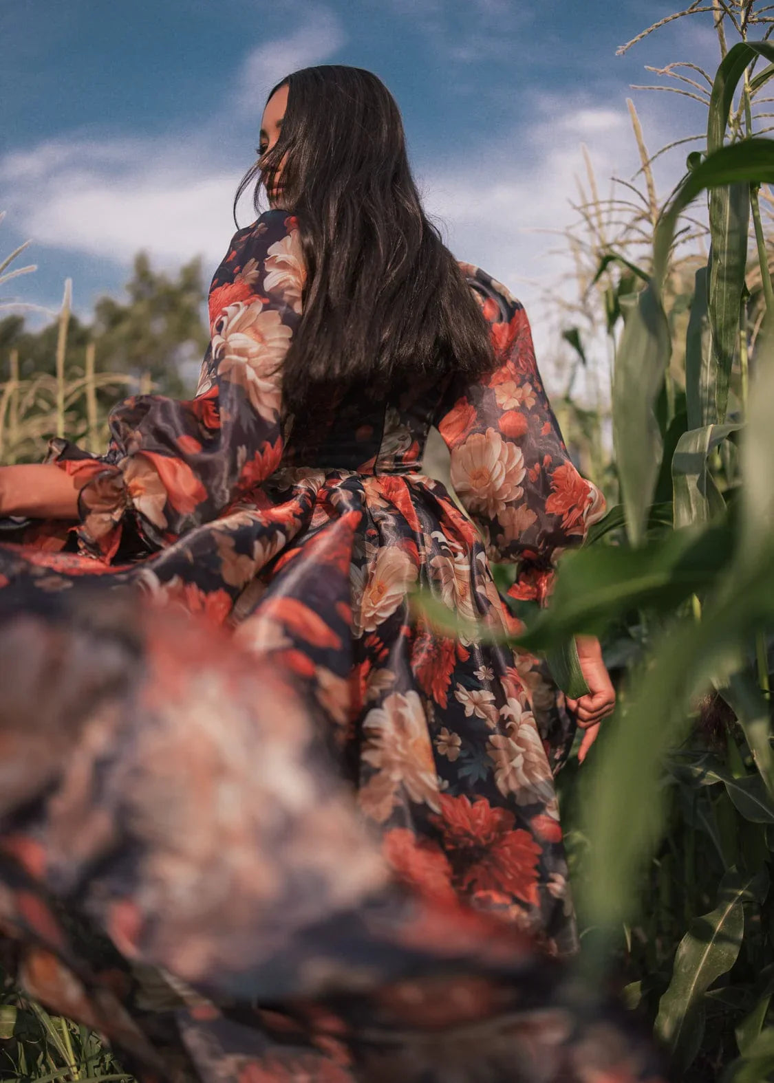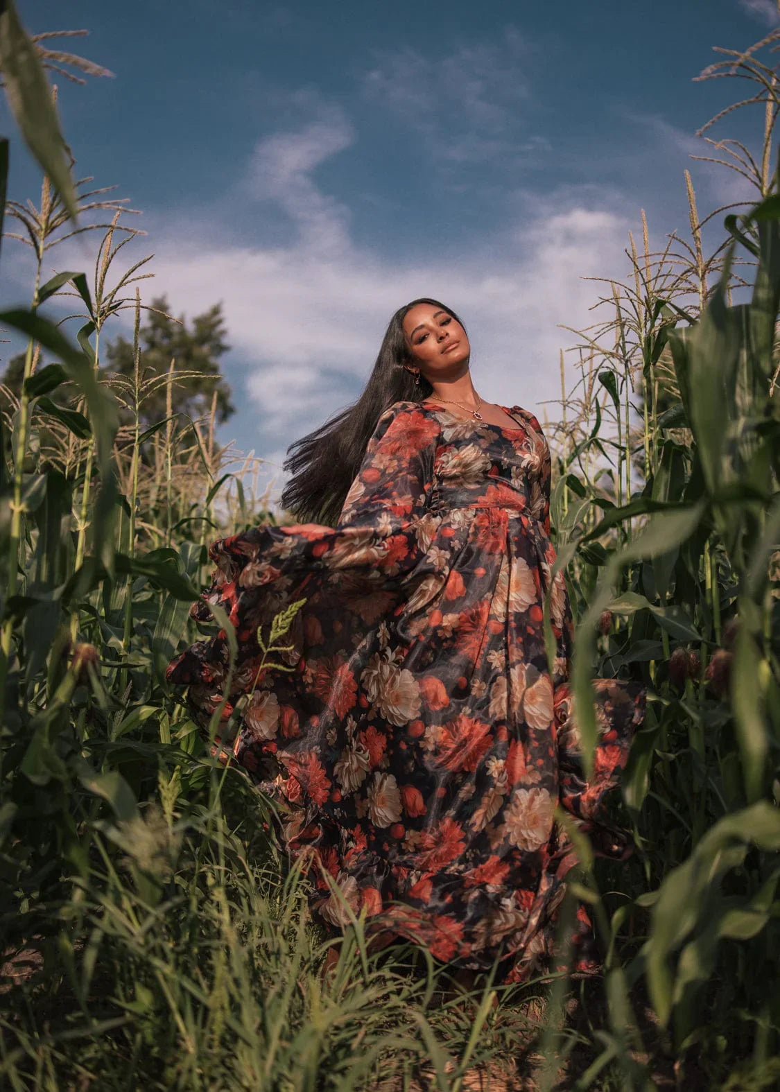 With its rich autumnal pattern and its flowing silhouette, the Sable Dress evokes the essence of a crisp evening in fall. Its elegant scoop neckline and voluminous sleeves bring vintage charm to this standout piece. Whether you're attending a formal event or a photoshoot for the season, this dress offers timeless beauty and effortless grace to any setting or occasion.